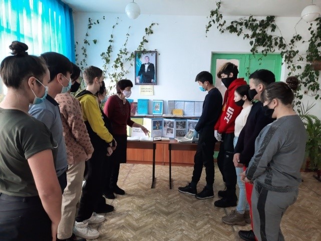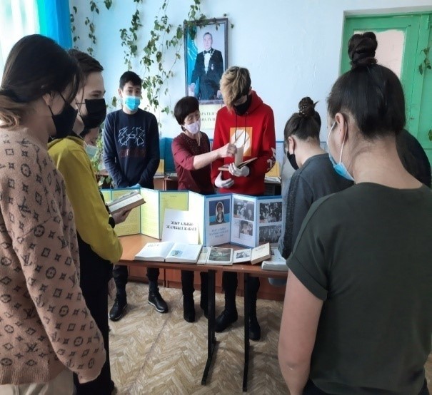 Қазақтың әйгілі жазушысы, қоғам қайраткері, Қазақстан Ғылым академиясының академигі, филология ғылымының тұңғыш докторы, профессор Мұхтар Әуезовтің туғанына 125 жыл толуына орай «Мұхтар Әуезов тағылымы» атты кітап көрмесі ұйымдастырылды. Кітапханашы көрмеге қойылған дүниежүзілік классика қорына еніп, ұлы ақын, ойшыл Абайдың өлмес бейнесін талант қуатымен ашып берген, жазушы шығармашылығының ел таныған асқар шыңы болып табылатын «Абай жолы» роман-эпопеясына , «Көксерек», «Қараш-қараш оқиғасы» повестеріне, «Қорғансыздың күні», «Жетім» әңгімелеріне шолу жасады. М. Әуезов жайлы жазылған баспасөз материалдарымен таныстырып өтті. Жазушының алғашқы әңгімелері мен зерттеу мақалалары «Абай», «Таң», «Шолпан» журналдарында жарияланған.