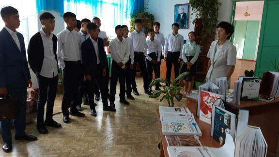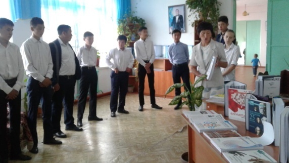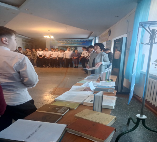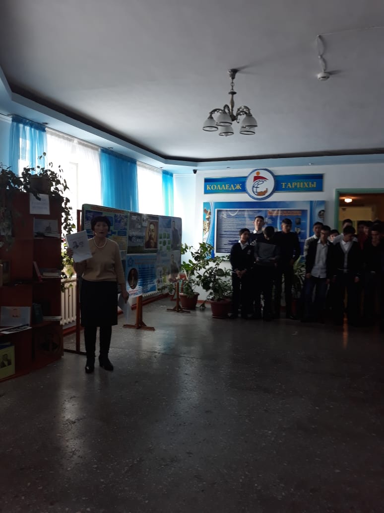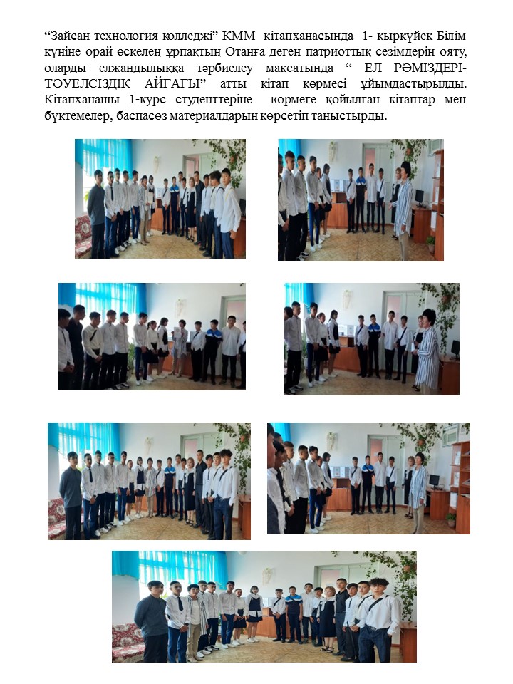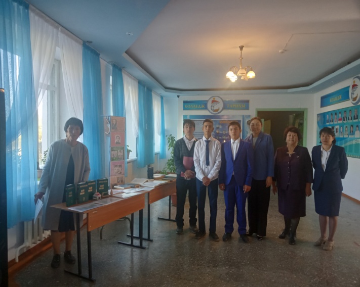 1-қыркүйек Білім күніне орай колледждің оқу залында «Рухани жаңғыру- ұлт болашағы» атты кітап көрмесі ұйымдастырылды. Онда «Жаңа гуманитарлық білім. Қазақ тіліндегі 100 жаңа оқулық» жобасы бойынша шығарылған кітаптар қойылды. І курс студенттері мен ата-аналарды көрмеге қойылған кітаптар, бүктемелер, баспасөз материалдарымен таныстырдым. Алдағы уақытта гуманитарлық білімнің барлық бағыттары бойынша әлемдегі ең үздік деген оқу орындарының 100 оқулығы қазақ тіліне аударылады. Дүние жүзіндегі таңдаулы университеттердің оқулығы негізінде білім алу мүмкіндігі бар екендігі студенттерге айтып таныстырылды.
