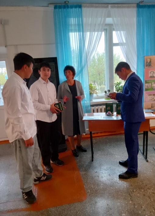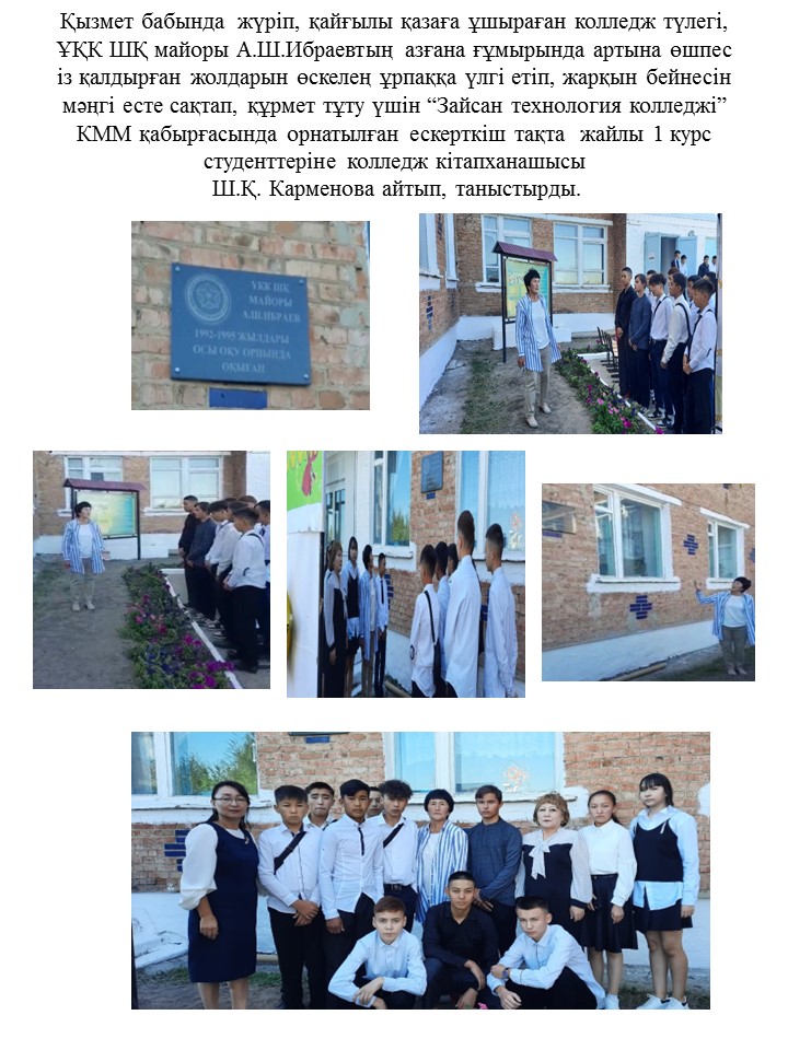 Осы колледждің «Ауыл шаруашылығы» тобының 1995 жылғы түлегі әскери көлік-ұшағы апатынан қаза тапқан ҚР ҰҚК Шекара Қызметінің майоры Алмаз Шаймұханбетұлы Ибраевқа арналып орнатылған мемориалдық тақта мен бұрышпен таныстырдым.