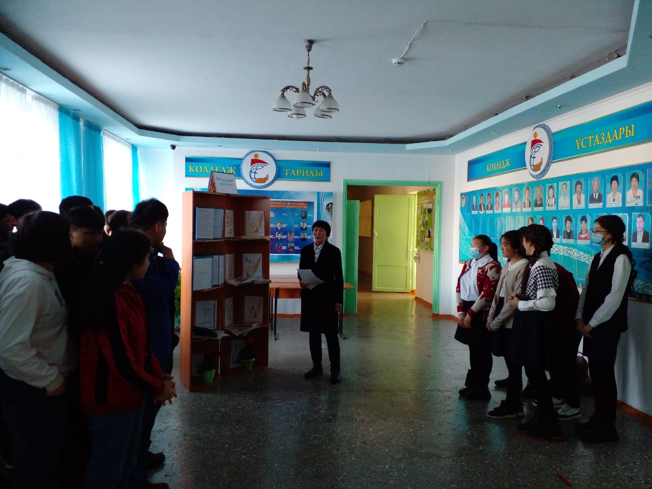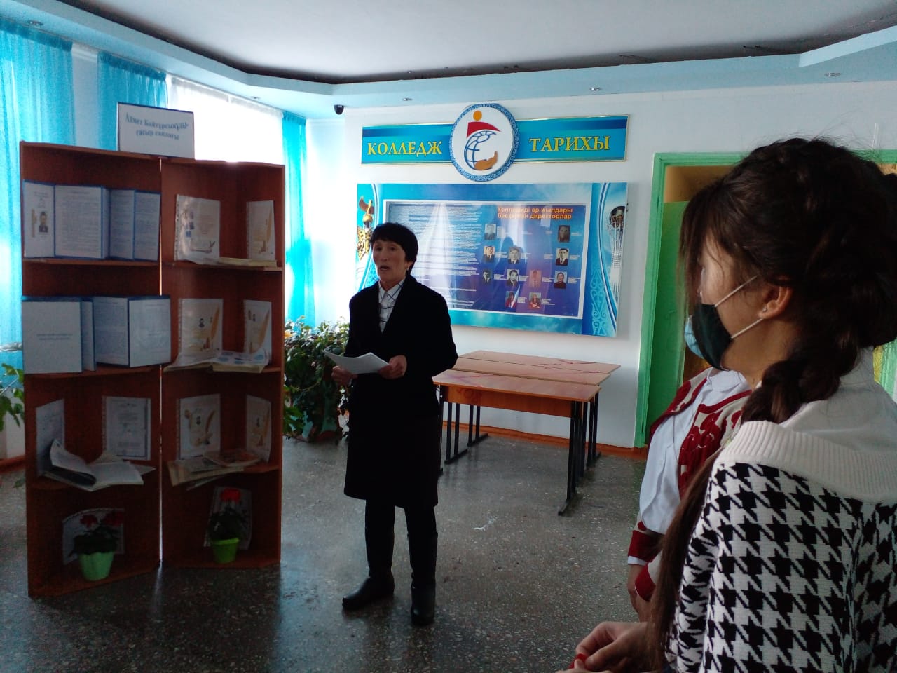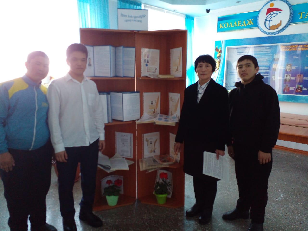 Фойеде колледж кітапханашысы Кәрменова Шолпан студенттерге «Ахмет Байтұрсынұлы-ғасыр саңлағы» тақырыбында кітап көрменсін ұйымдастырды. Ғалымның шығармашылық қызметін ашып көрсететін кең көлемді кітап көрмесін ұйымдастырды. Көрмеге қазақ тілі білімінің іргетасын қалаушы, ірі-ғалым, ағартушы – педагог, сөз құдіретін танытқан танымал ақын, қазақ баспасөз тілінің ұлттық үлгісін көрсеткен талантты публицист, туған халқының рухани дүниесін көтеруге көп күш жұмсаған мәдениет қайраткері – Ахмет Байтұрсыновтың «Ақ жол», «Тіл тағылымы», «Маса», «Жоқтау» т.б. қаламынан туған шығармалары көпшілік қауымға ұсынылды.