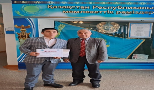 1.Сертификат «Креативное выражение мысли» номинациясы. 2.Құрмет грамотасы Халық әртістері ағайынды Абдуллиндер атындағы ШҚ өнер училищесінің директоры А.Дюсупова |
