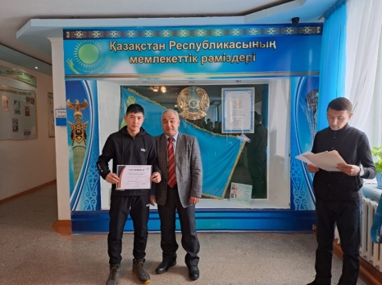 ШҚО ТжКББ ұйымдары студенттері арасында қазақ күресінен «Колледж барысы 2023» турнирі 80 кг дейінгі салмақта белсене қатысқаны үшін. Зайсан қаласы, 01.12.2023жыл |