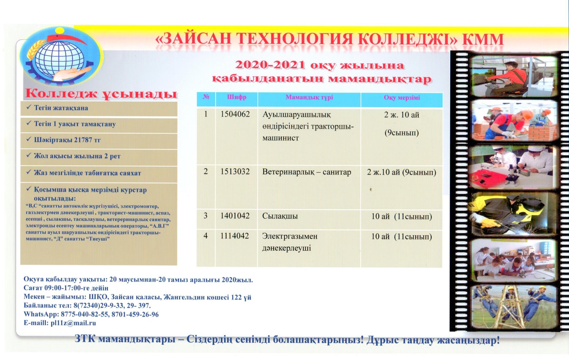 Зайсан технология колледжі кәсіби білім беру саласында 75 жылдан астам қызмет атқарып келеді. Колледж бітірушілерге оқыған жылының мерзіміне сәйкес өтілі жазылып, еңбек кітапшасы беріледі.